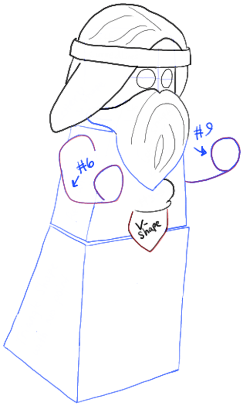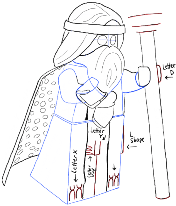 – Draw a sideways letter ‘VW’ shape on the robe. Draw a blocky- letter ‘Y’ shape in the middle of the robe. Draw a backwards letter ‘L’ shape on the right side of the robe.