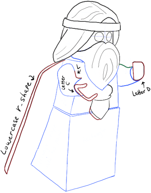 – Draw a letter ‘L’-like shape on the left arm.