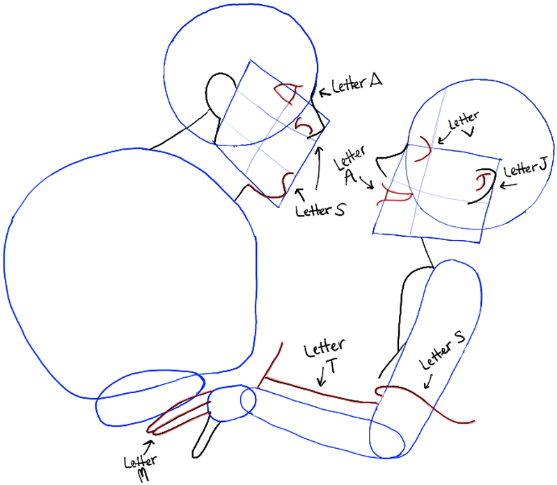 Giselle: Draw her eye as a sideways letter ‘A’ shape. Draw a letter ‘v’ shaped eye. Draw a letter ‘J’ shape in her ear. Draw a letter ‘s’ and ‘T’ shape in the arm area. Draw letter ‘M’ shaped fingers.