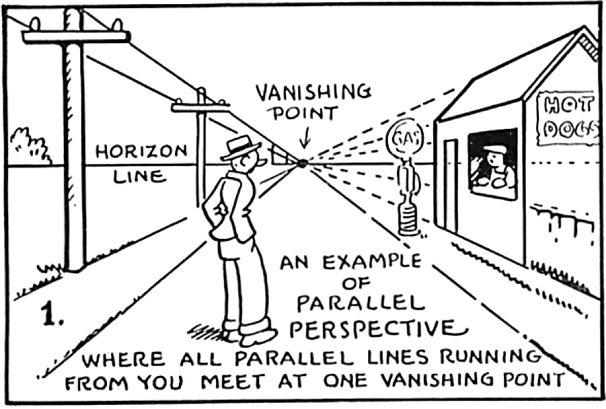 There are times when a cartoonist must show depth and distance in his picture, as well as the correctness of details that correct use of perspective can give.