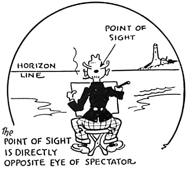Notice above the horizon line. This is where the sky and land seem to meet. The dot this in inside the man’s head, above, is called the Point of Sight and it is the point that is directly opposite the eye of the viewer.