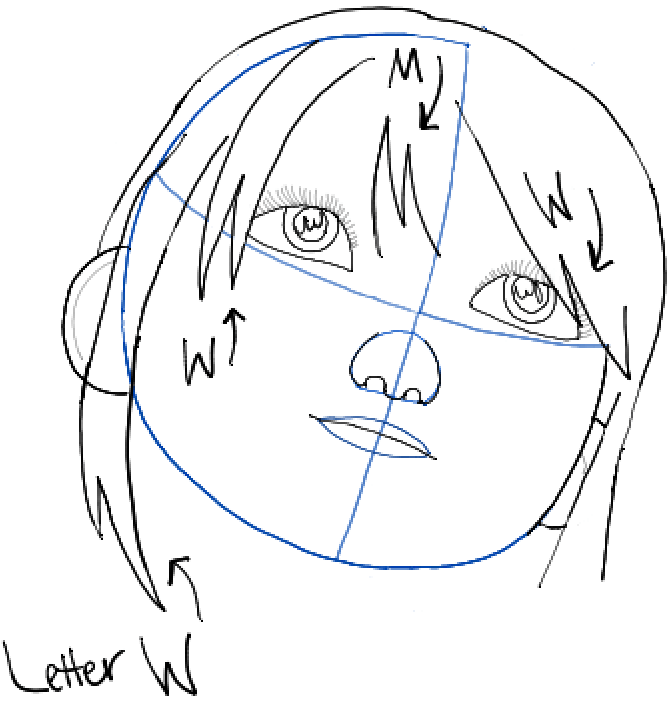 – Draw some letter ‘M’ and ‘W’ shapes in the hair.