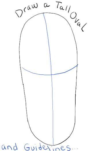 – Draw a tall-squash-shaped oval for the head. Draw guidelines within the face to help you place facial features.