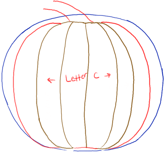 – Draw letter ‘c’ shapes again on either side of the pumpkin’s inner lines.