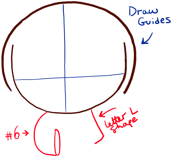 – Draw a letter ‘v’ shape on the left side of the face. Draw an ear on the right side of the face.