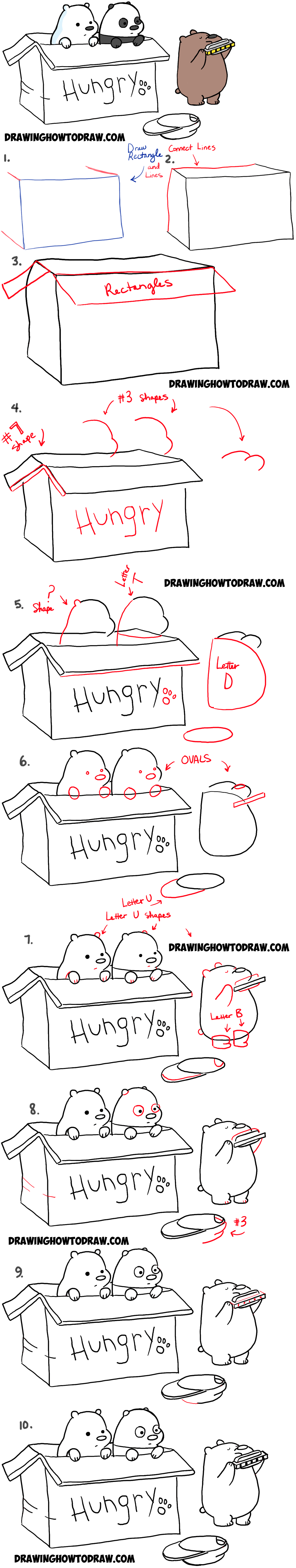 Learn how to draw baby versions of the We Bare Bears Characters, including baby Grizzly, baby Panda, and baby Ice Bear. We will guide you thru each step with easy to follow instructions that you will be able to follow. We will show you that these characters can all be drawn with letters, numbers, or geometric shapes. Have fun.