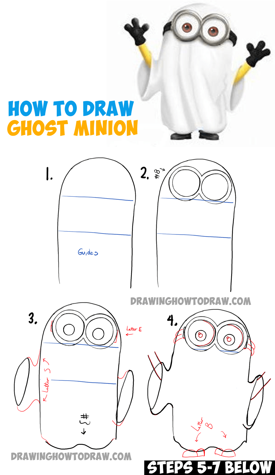 I hope that this tutorial helped you draw a Minion dressed up as a ghost for Trick-or-Treating. Come back soon for more drawing tutorials.
