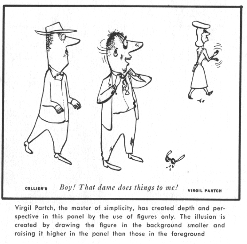 As we have said before, perspective for the cartoonist is more of a corrective tool than an iron-bound set of rules to follow. The important thing is that the inked lines do go in the correct direction, which calls for the artist to have a fine understanding of the rules. As with drawing the figure, the cartoonist must first have a good knowledge of what is correct before he can simplify and take liberties with perspective.