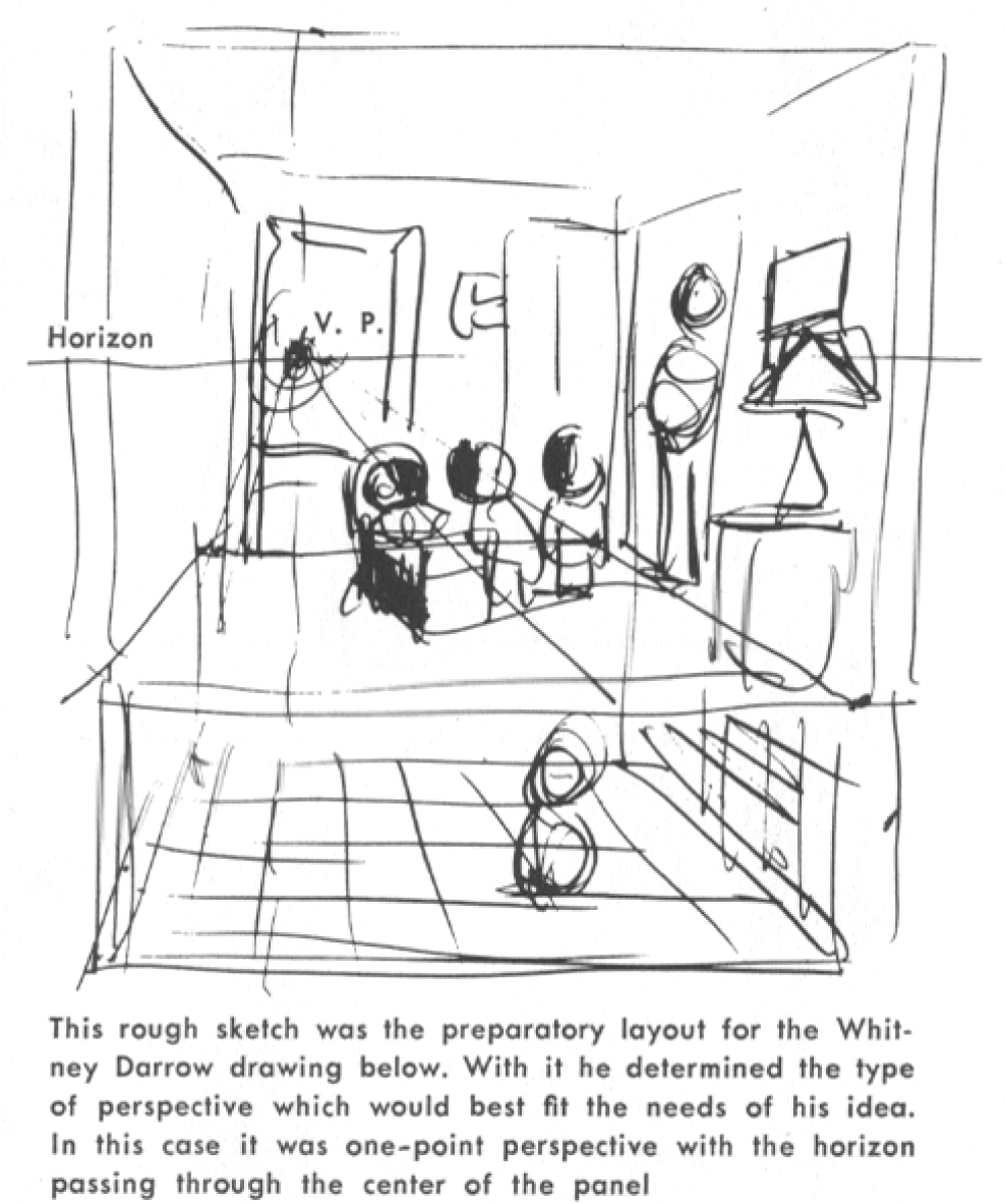 apply to the daily drawing of cartoons- you will notice that in some places the finished ink lines of the drawings do not follow exactly the perspective lines. These are not errors, but they deliberately stretch the rules to emphasize a point or to permit the showing of more of the object or room.