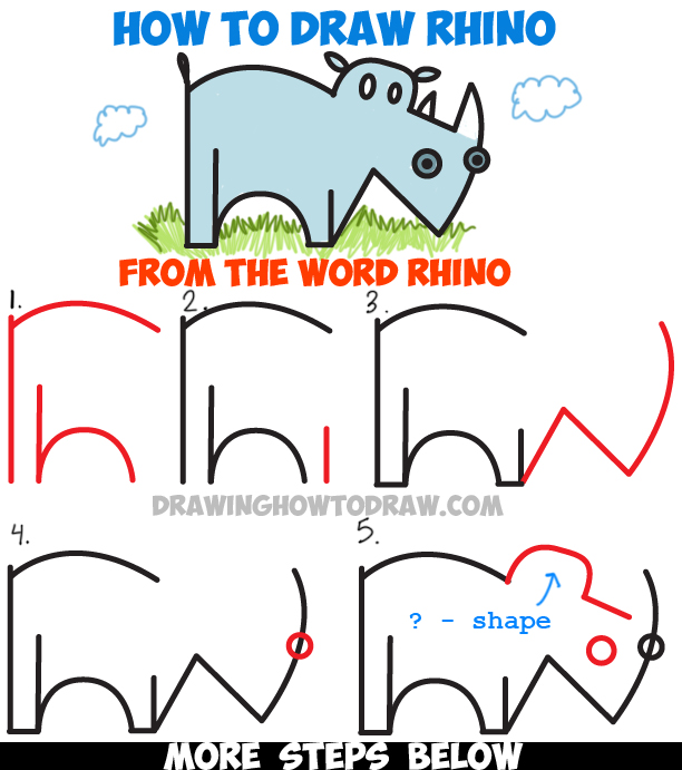 Learn How to Draw a Cartoon Rhinoceros from the Word Rhino – Simple Step by Step Drawing Tutorial for Kids