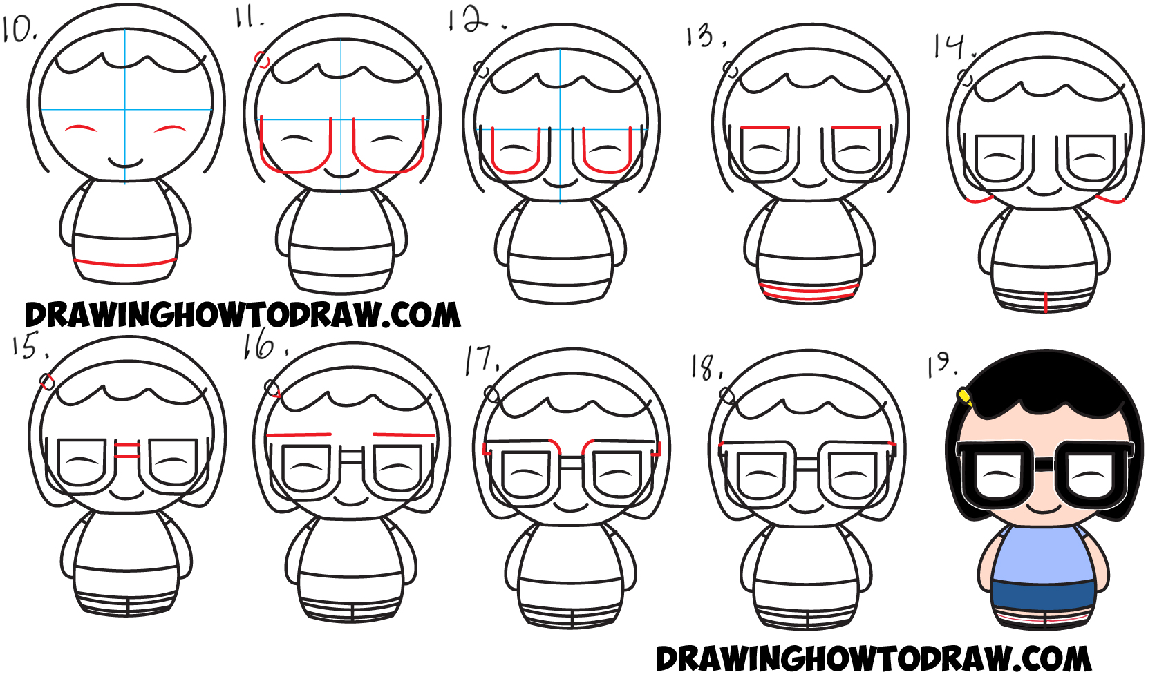 Today I will show you how to draw a cute, baby, kawaii, chibi Tina from Bob’s Burgers. Tina is the older girl with the glasses and the blue shirt. This chibi Tina is based on the