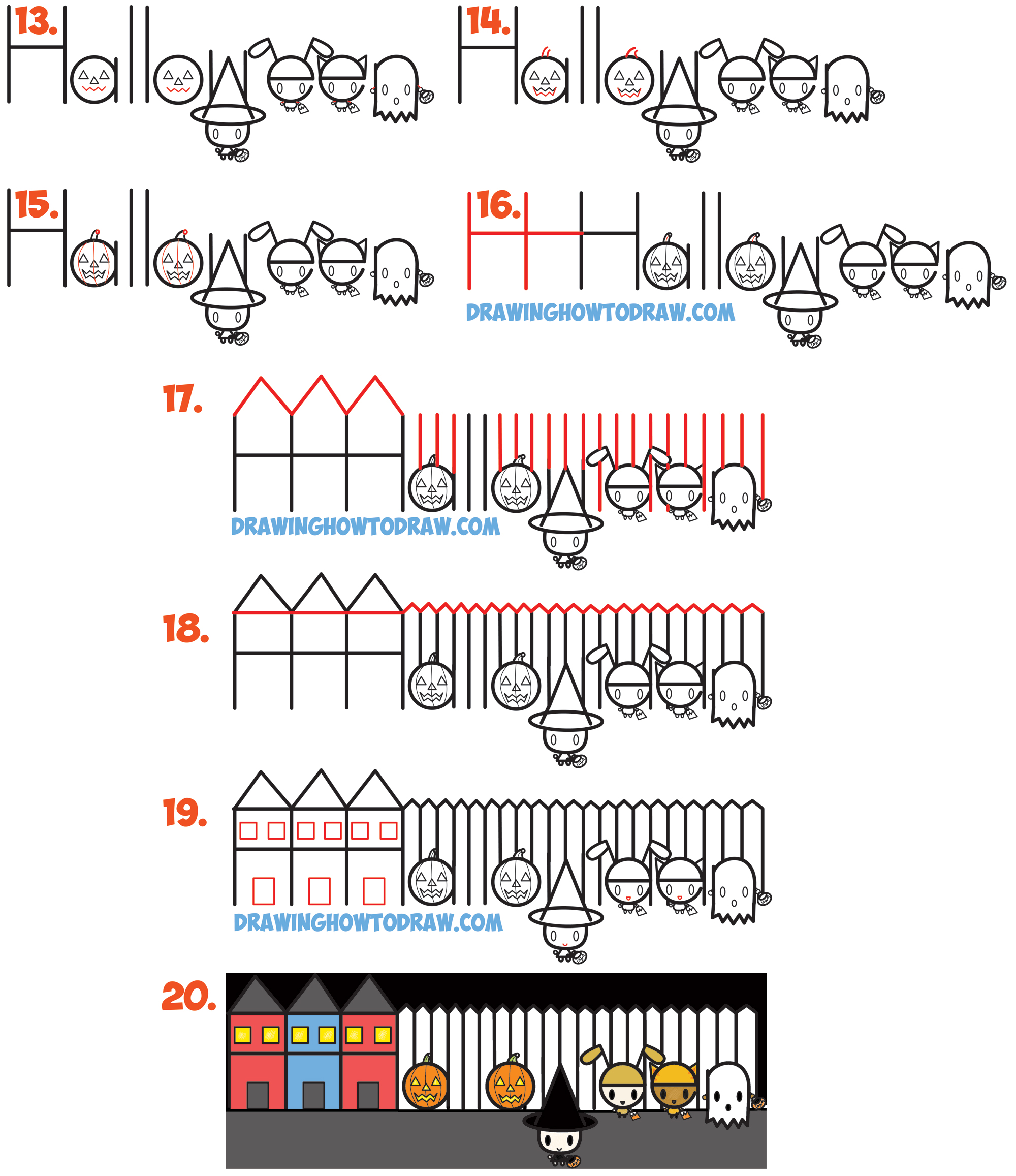 Learn How to Cartoon Draw Halloween Trick or Treating Scene from the Word (Word Cartoons Simple Step by Step Drawing Lesson for Kids)