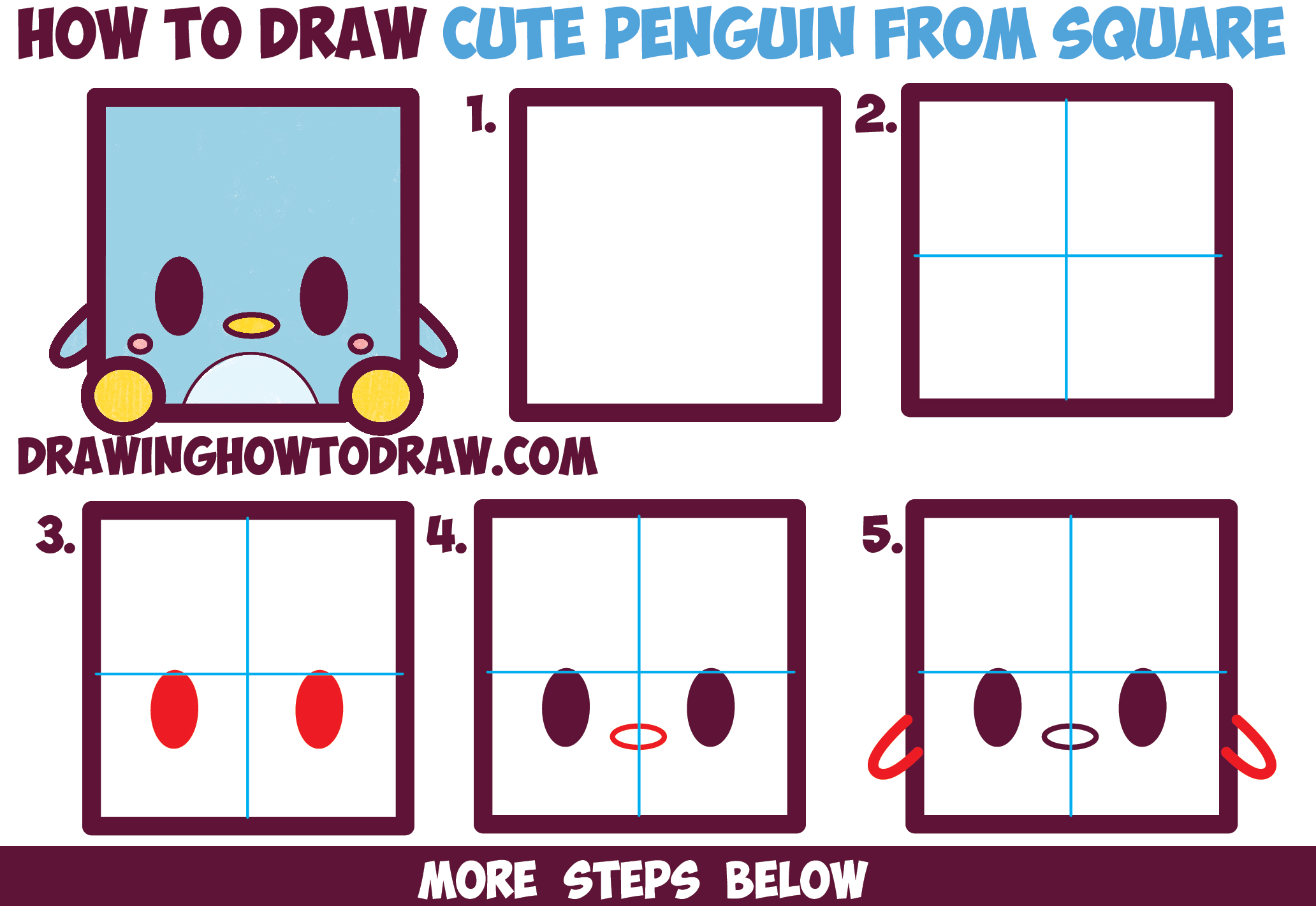 Learn How to Draw Cute / Kawaii Penguins from Square Shape with Simple Steps Drawing Lesson for Kids and Beginners