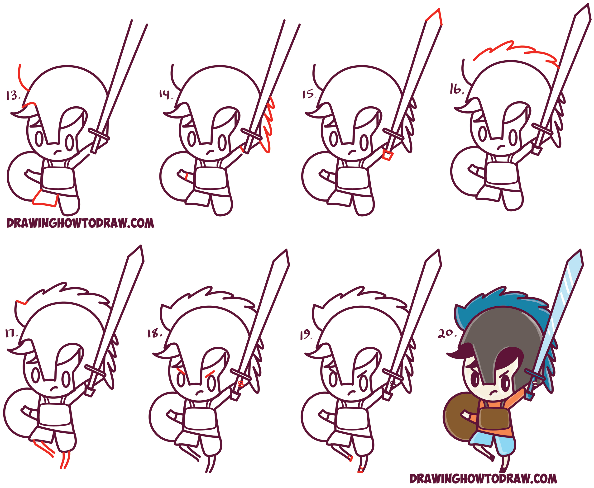 (Step 10) Draw 2 lines for part of his sword and 2 curved letter ‘v’ shapes for his hair.