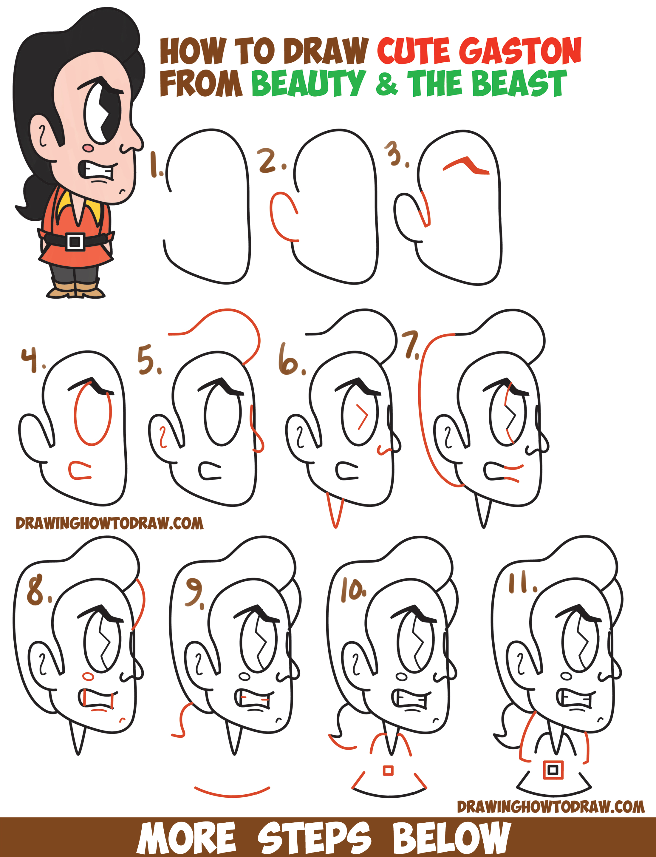 Learn How to Draw Gaston from Disney’s Animated Beauty and the Beast (Cute / Kawaii / Chibi) Simple Steps Drawing Lesson for Children