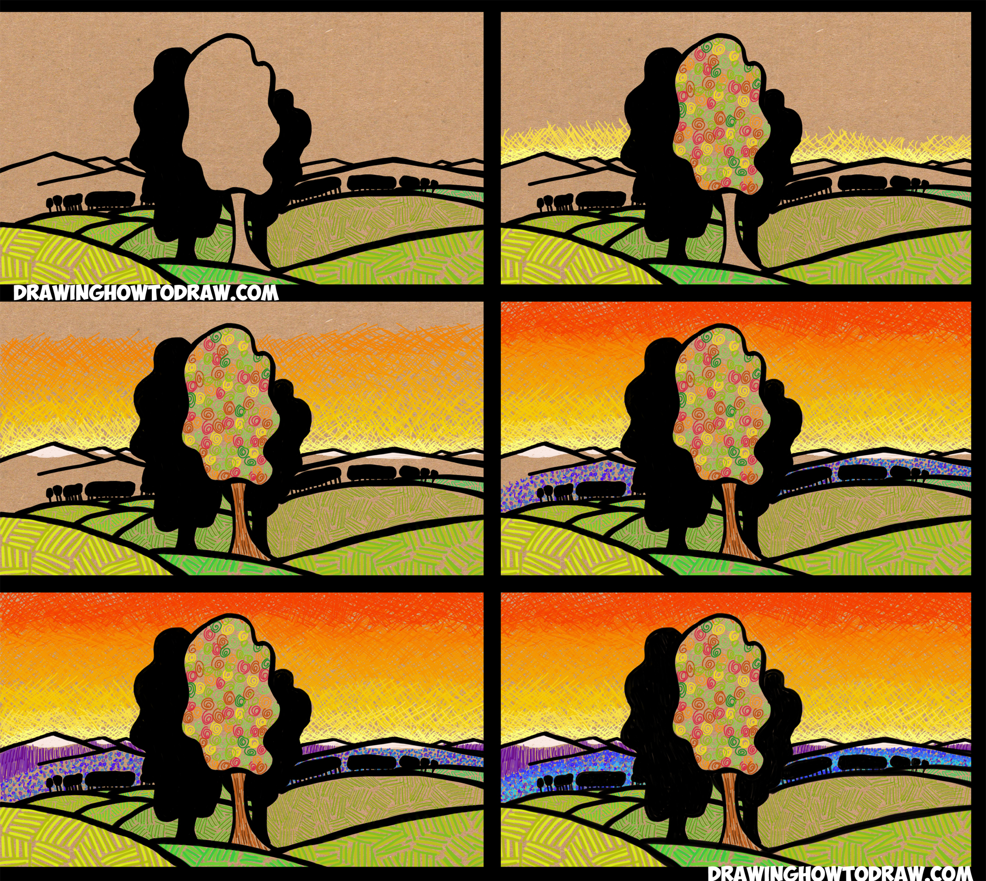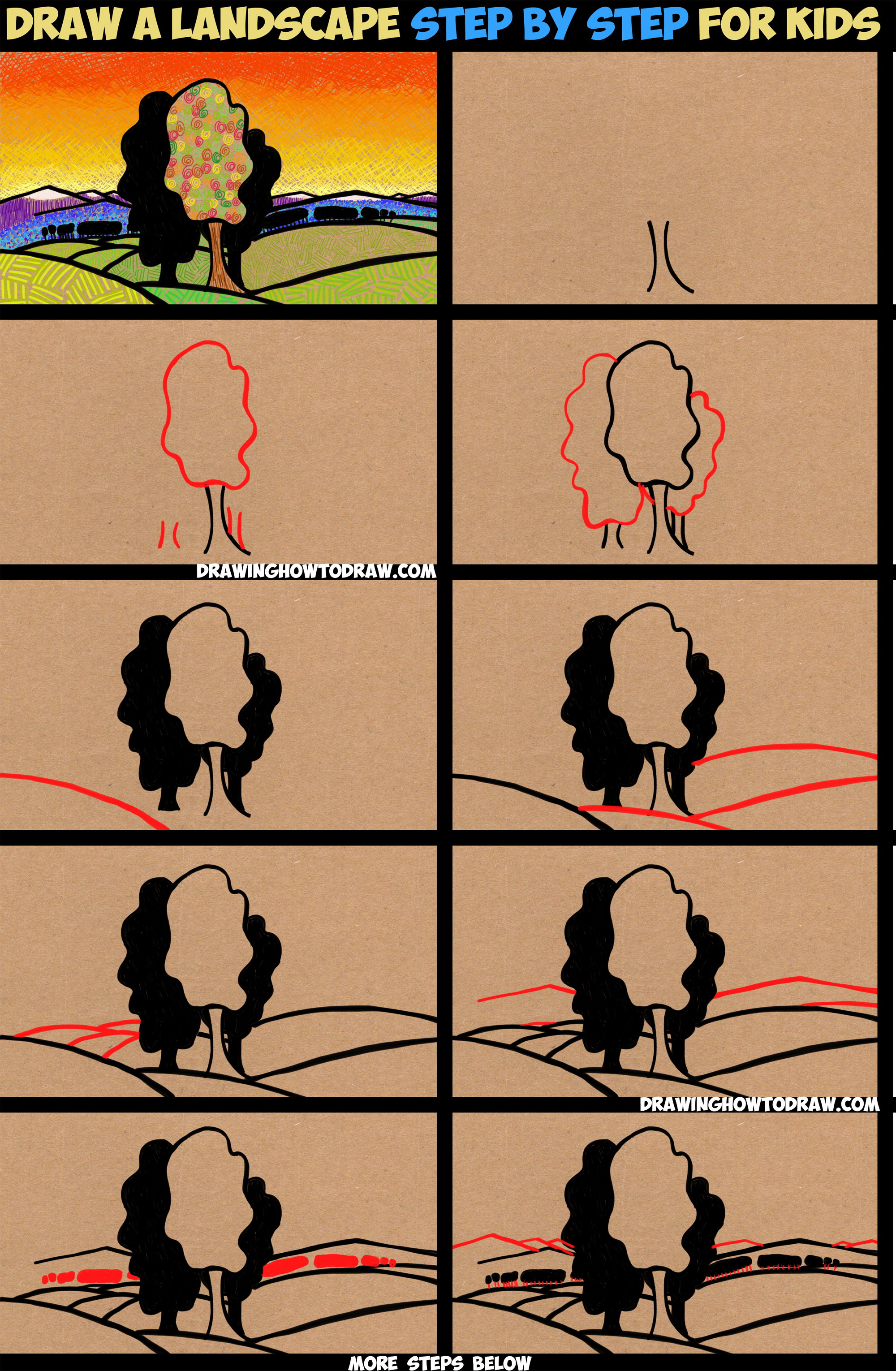 Learn How to Draw Landscapes (Sunset, Mountains, Hills, Trees) for Kids Simple Steps Drawing Lesson Using Patterns to Add Texture (Great Art Lesson for Children)