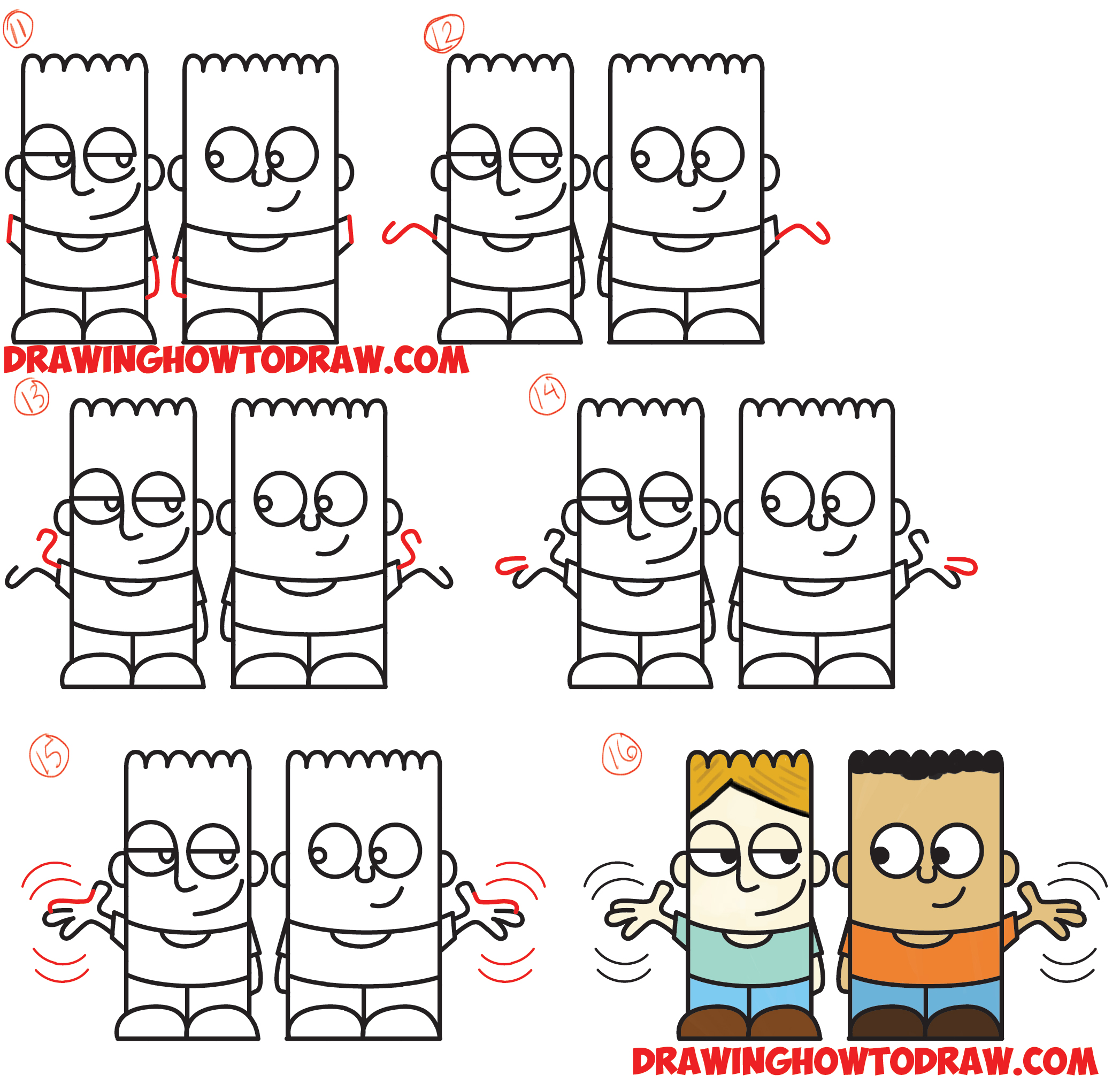 (Step 10) Draw 2 lines for one arm and an “L” shape for the other arm – on both characters.