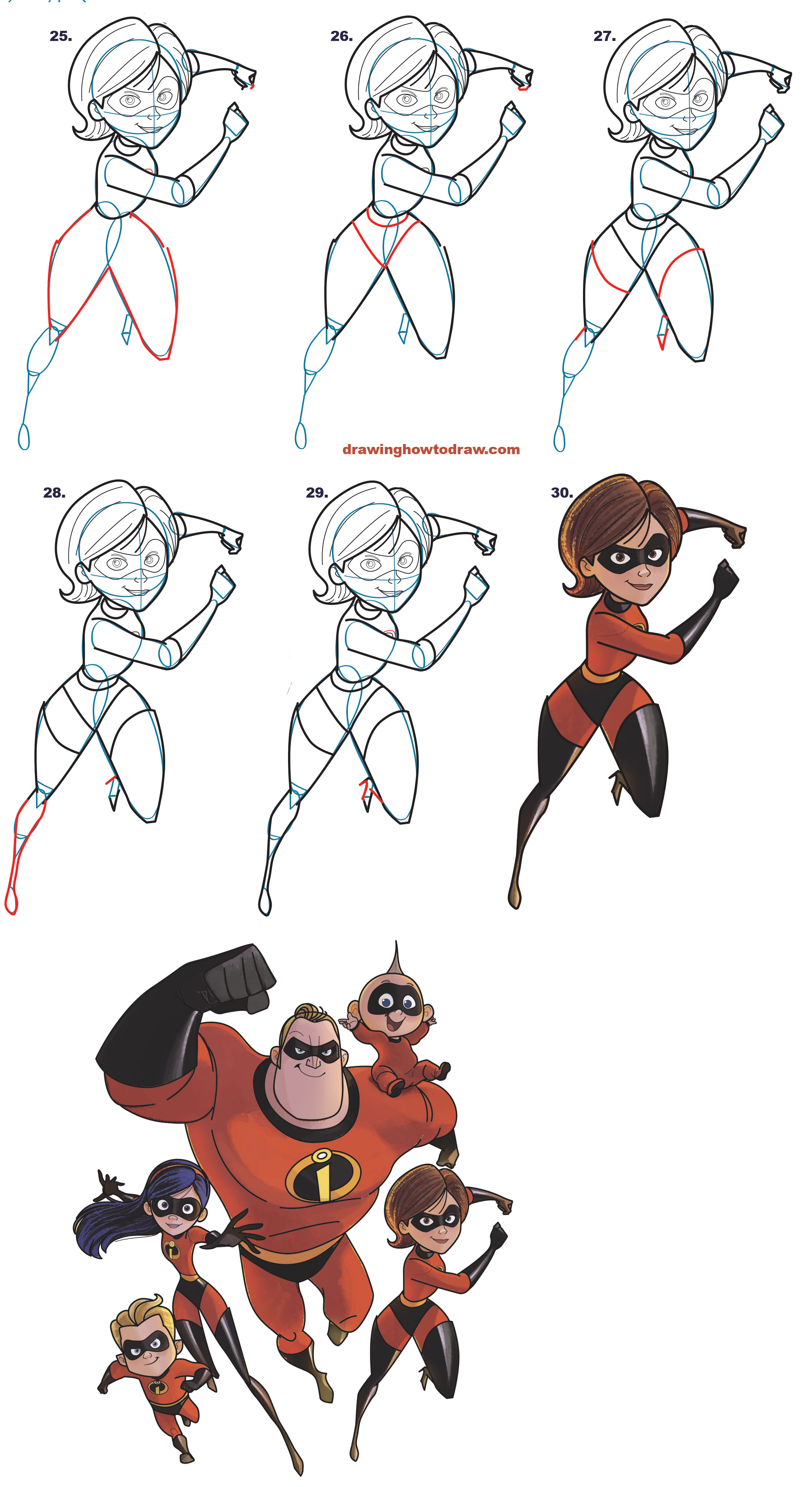 Today I’ll show you how to draw Elastigirl…the mom from The Incredibles 1 and The Incredibles 2. This is part 4 of a 5 part series on how to draw the entire Incredibles family.