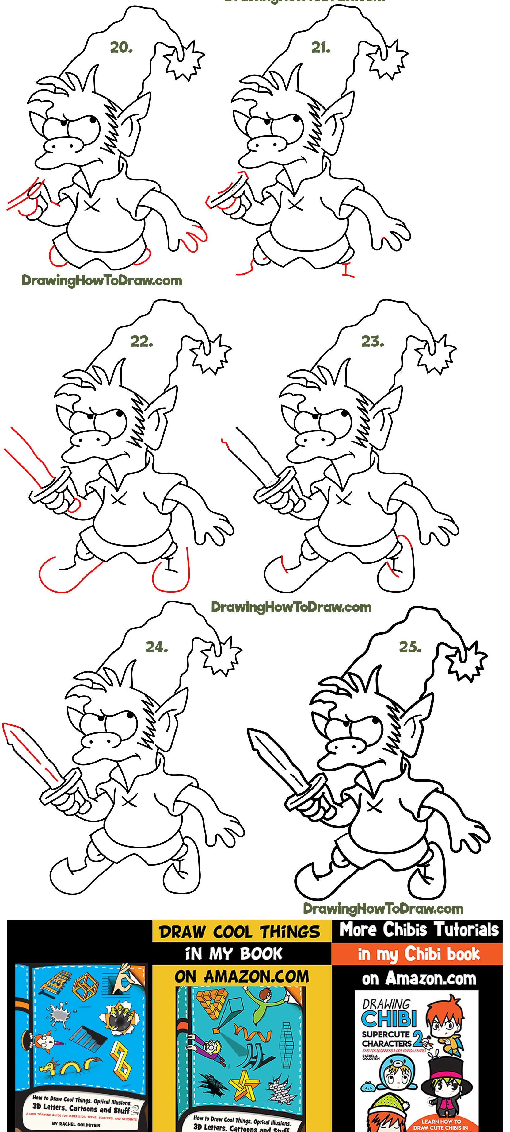 (Step 22) Draw a wiggly line and a curved line on his sword. Draw “J” like feet.