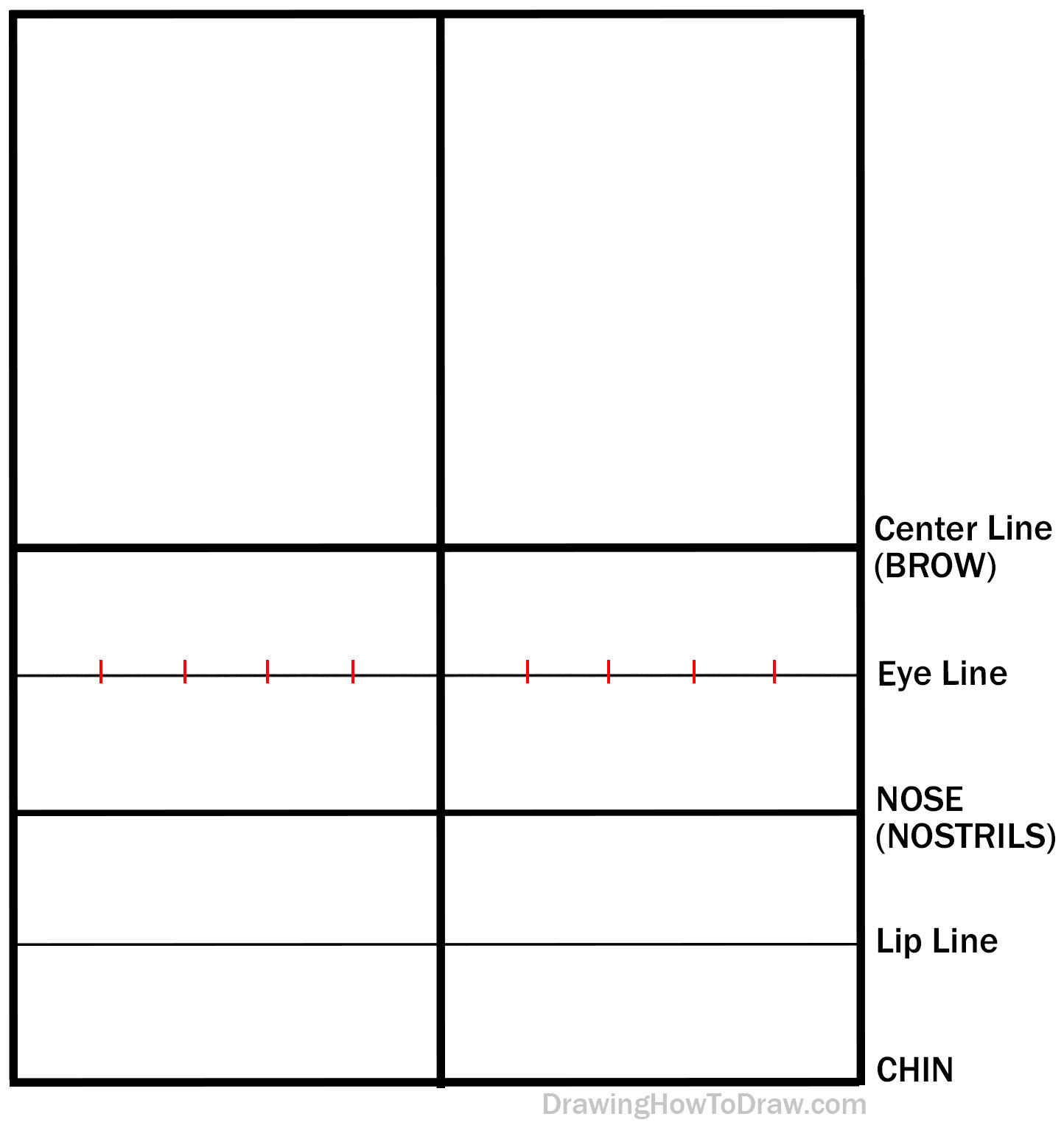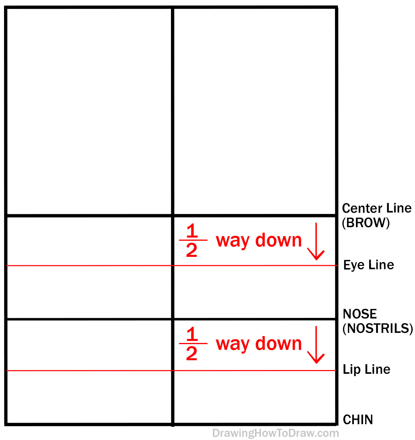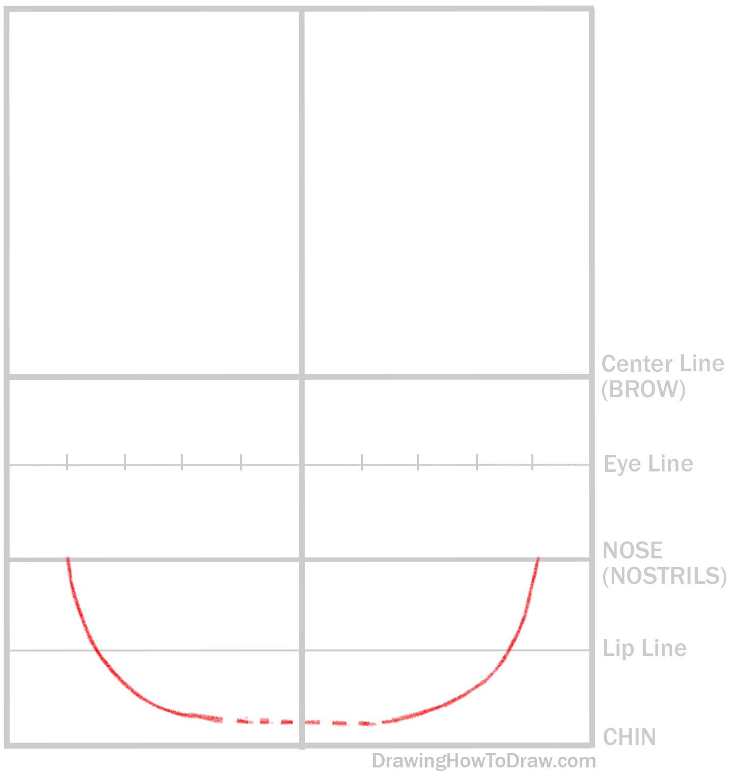 Go down 1/2 of the way from the “nose line” to the bottom of the rectangle to find the “mouth line”.