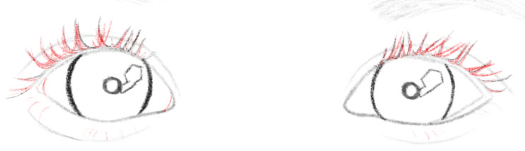 Take the lashes that you drew in Step 16A and build upon them, making them thicker and shaped more like lashes. Draw a curved line on both sides of the left eye. Draw curved lines for lower eyelashes.
