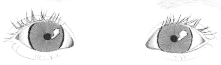 Draw more lines radiating outward from the pupil. Then shade the iris more to give it a darker tint. Add to the lower eyelashes so they are thicker at the base.