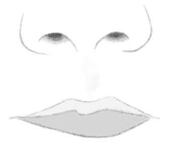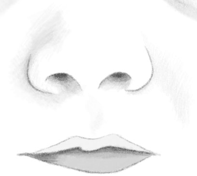 Shade the lighter tones of the nose. Shade the divot below the nose. Draw lines to the lips and continue shading them.