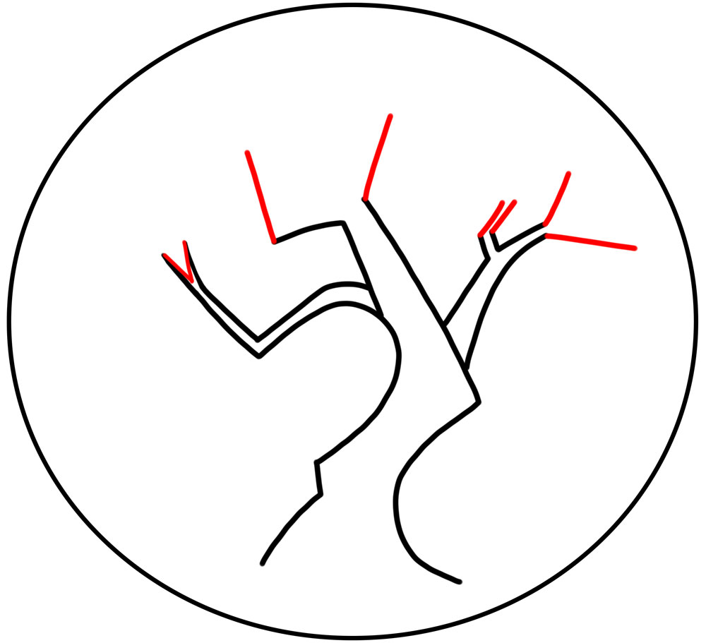 Continue adding to the branches. The branch on the left sort of looks like a “Y” now and the branch on the right has a sideways “V” in it.