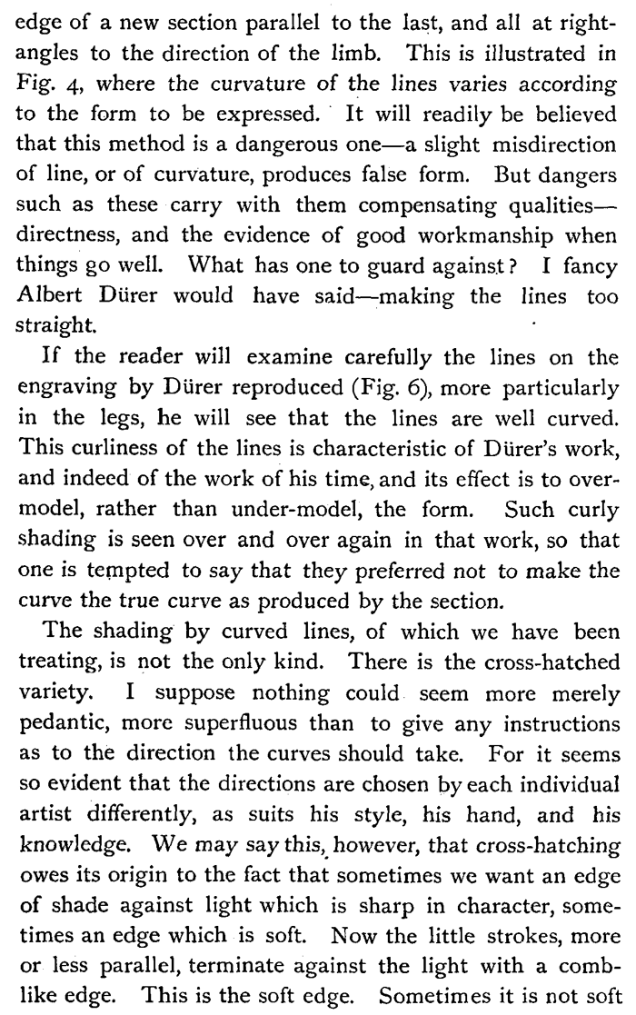 The shading by curved lines, of which we have been treating, is not the only kind. There is the cross-hatched variety. I suppose nothing could seem more merely pedantic, more superfluous than to give any instructions as to the direction the curves should take. For it seems so evident that the directions are chosen by each individual artist differently, as suits his style, his hand, and his knowledge. We may say this, however, that cross-hatching owes its origin to the fact that sometimes we want an edge of shade against light which is sharp in character, sometimes an edge which is soft. Now the little strokes, more or less parallel, terminate against the light with a comb-like edge. This is the soft edge. Sometimes it is not soft