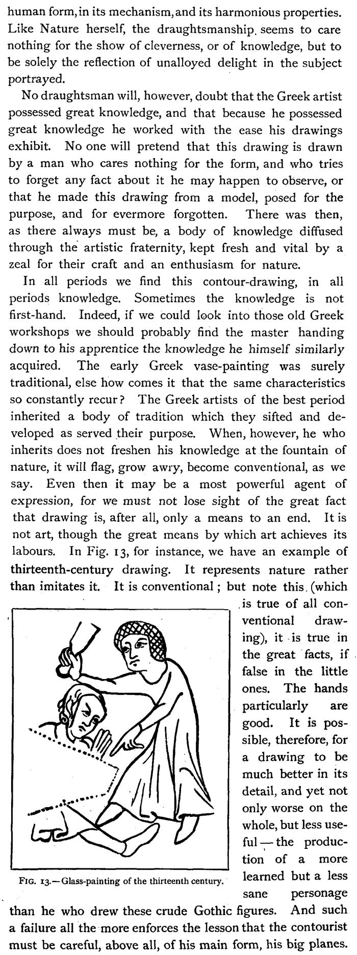 In all periods we find this contour-drawing, in all periods knowledge. Sometimes the knowledge is not first-hand. Indeed, if we could look into those old Greek workshops we should probably find the master handing down to his apprentice the knowledge he himself similarly acquired. The early Greek vase-painting was surely traditional, else how comes it that the same characteristics so constantly recur ? The Greek artists of the best period inherited a body of tradition which they sifted and developed as served their purpose. When, however, he who inherits does not freshen his knowledge at the fountain of nature, it will flag, grow awry, become conventional, as we say. Even then it may be a most powerful agent of expression, for we must not lose sight of the great fact that drawing is, after all, only a means to an end. It is not art, though the great means by which art achieves its labors. In Fig. 13, for instance, we have an example of thirteenth-century drawing. It represents nature rather than imitates it. It is conventional ; but note this, (which is true of all conventional drawing), it is true in the great facts, if false in the little ones. The hands particularly are good. It is possible, therefore, for a drawing to be much better in its detail, and yet not only worse on the whole, but less useful — the production of a more learned but a less sane personage than he who drew these crude Gothic figures. And such a failure all the more enforces the lesson that the contourist must be careful, above all, of his main form, his big planes.