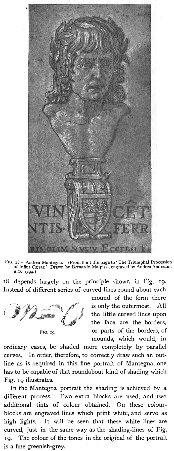 In the Mantegna portrait the shading is achieved by a different process. Two extra blocks are used, and two additional tints of color obtained. On these color are engraved lines which print white, and serve as high lights. It will be seen that these white lines are curved, just in the same way as the shading-lines of Fig. 19. The color of the tones in the original of the portrait is a fine greenish-grey.