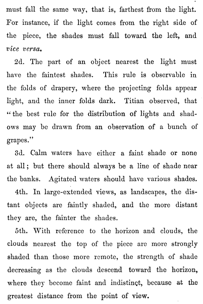 must fall the same way, that is, farthest from the light. For instance, if the light comes from the right side of the piece, the shades must fall toward the left, and vice versa. |