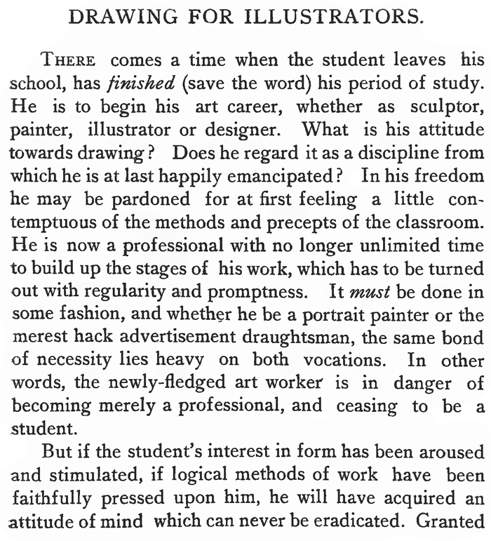 There comes a time when the student leaves his school, has finished (save the word) his period of study. He is to begin his art career, whether as sculptor, painter, illustrator or designer. What is his attitude towards drawing ? Does he regard it as a discipline from which he is at last happily emancipated ? In his freedom he may be pardoned for at first feeling a little contemptuous of the methods and precepts of the classroom. He is now a professional with no longer unlimited time to build up the stages of his work, which has to be turned out with regularity and promptness. It must be done in some fashion, and whether he be a portrait painter or the merest hack advertisement draftsman, the same bond of necessity lies heavy on both vocations. In other words, the newly-fledged art worker is in danger of becoming merely a professional, and ceasing to be a student.