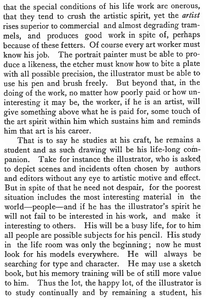 But if the student's interest in form has been aroused and stimulated, if logical methods of work have been faithfully pressed upon him, he will have acquired an attitude of mind which can never be eradicated. Granted that the special conditions of his life work are onerous, that they tend to crush the artistic spirit, yet the artist rises superior to commercial and almost degrading trammels, and produces good work in spite of, perhaps because of these fetters. Of course every art worker must know his job. The portrait painter must be able to produce a likeness, the etcher must know how to bite a plate with all possible precision, the illustrator must be able to use his pen and brush freely. But beyond that, in the doing of the work, no matter how poorly paid or how uninteresting it may be, the worker, if he is an artist, will give something above what he is paid for, some touch of the art spirit within him which sustains him and reminds him that art is his career.