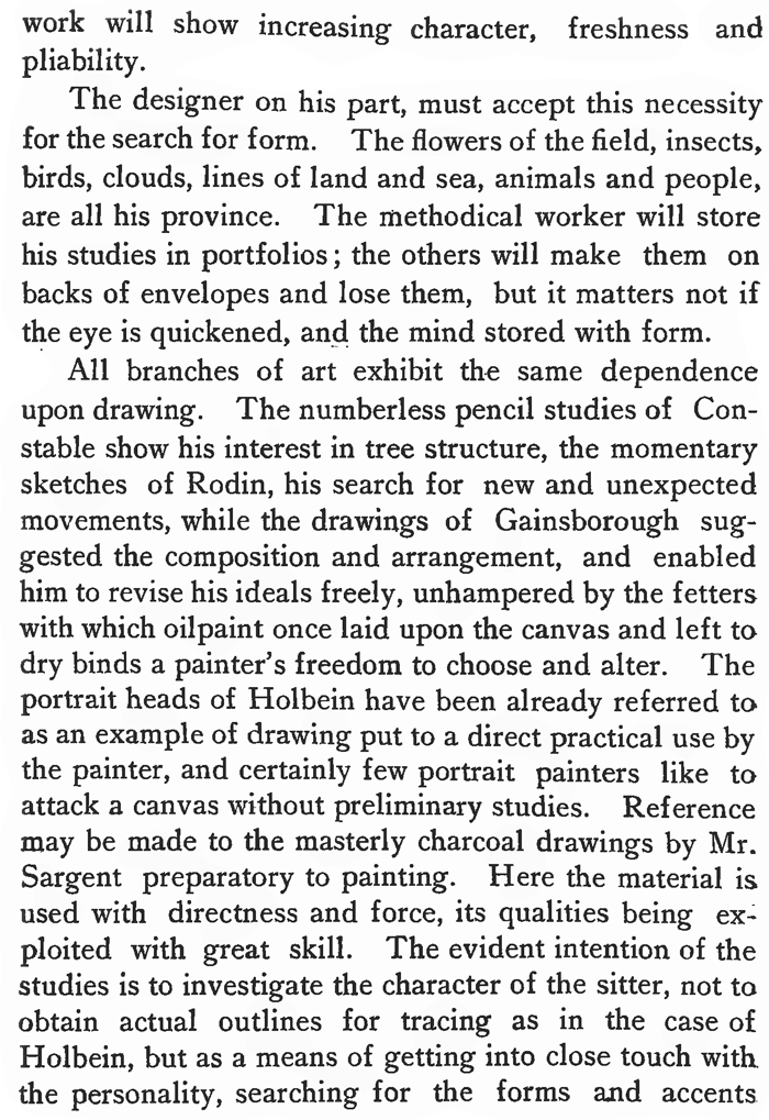 The designer on his part, must accept this necessity for the search for form. The flowers of the field, insects, birds, clouds, lines of land and sea, animals and people, are all his province. The methodical worker will store his studies in portfolios ; the others will make them on backs of envelopes and lose them, but it matters not if the eye is quickened, and the mind stored with form.