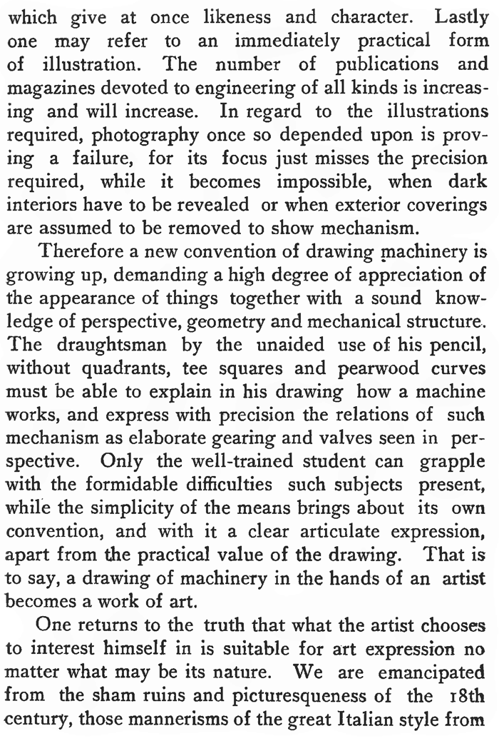 Therefore a new convention of drawing machinery is growing up, demanding a high degree of appreciation of the appearance of things together with a sound knowledge of perspective, geometry and mechanical structure. The draftsman by the unaided use of his pencil, without quadrants, tee squares and pearwood curves must be able to explain in his drawing how a machine works, and express with precision the relations of such mechanism as elaborate gearing and valves seen in perspective. Only the well-trained student can grapple with the formidable difficulties such subjects present, while the simplicity of the means brings about its own convention, and with it a clear articulate expression, apart from the practical value of the drawing. That is to say, a drawing of machinery in the hands of an artist becomes a work of art.