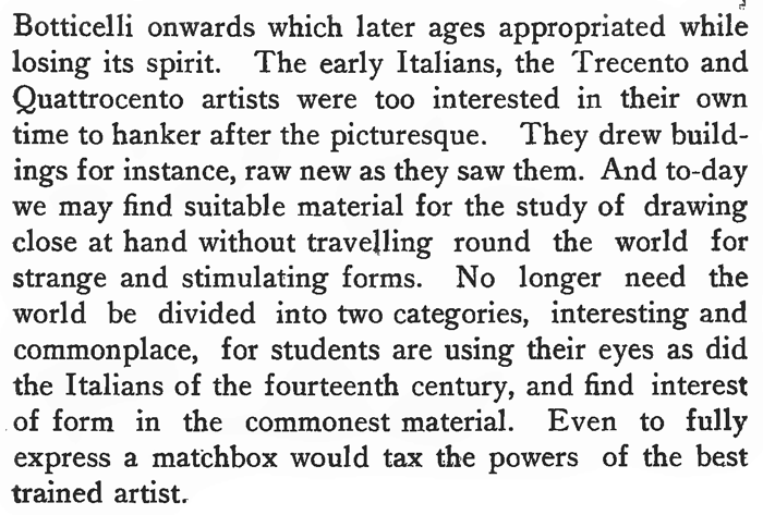 One returns to the truth that what the artist chooses to interest himself in is suitable for art expression no matter what may be its nature. We are emancipated from the sham ruins and picturesque-ness of the r8th century, those mannerisms of the great Italian style from Botticelli onwards which later ages appropriated while losing its spirit. The early Italians, the Trecento and Quattrocento artists were too interested in their own time to hanker after the picturesque. They drew buildings for instance, raw new as they saw them. And to-day we may find suitable material for the study of drawing close at hand without traveling round the world for strange and stimulating forms. No longer need the world be divided into two categories, interesting and commonplace, for students are using their eyes as did the Italians of the fourteenth century, and find interest of form in the commonest material. Even to fully express a matchbox would tax the powers of the best trained artist.