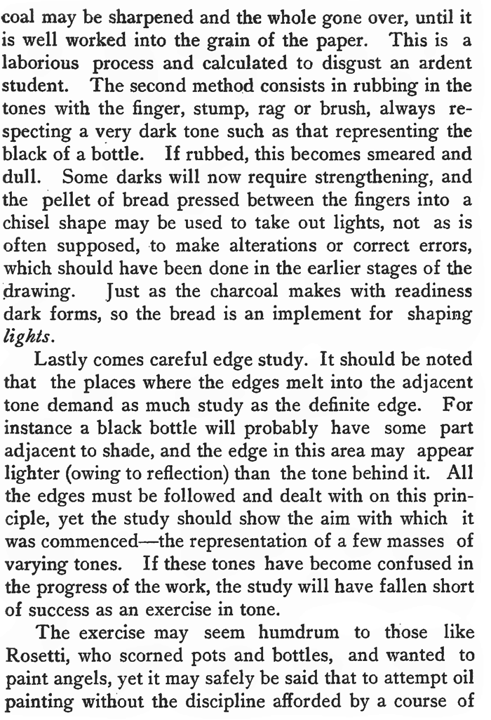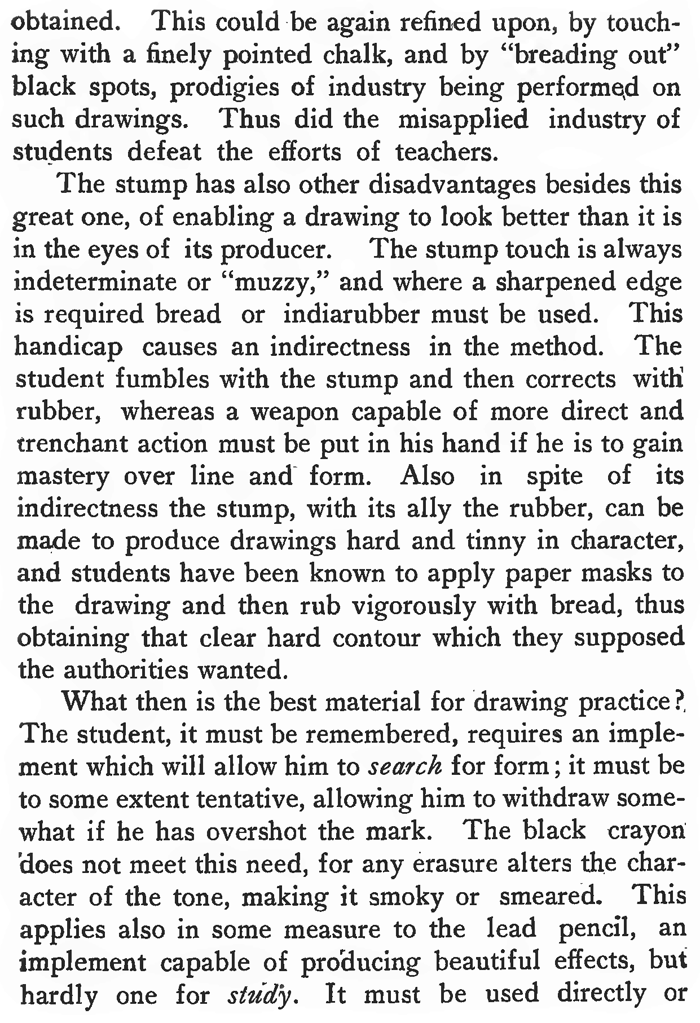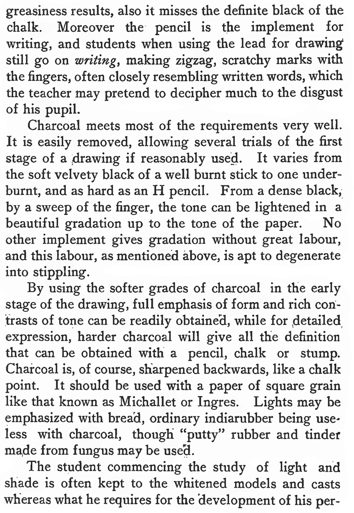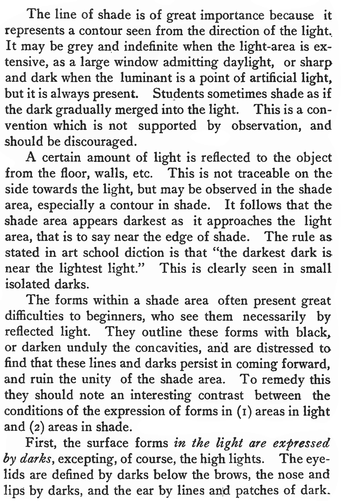 The text above is made up of images, to copy some text, it is below. TONE STUDY—PRELIMINARY.Young students, especially if they have been kept at outline work, consider it a great privilege to be allowed to "shade," and the unfortunate distinction they draw between "drawing" and "shading" is responsible for their oftentimes slow progress in the study of form. First the terms used must be explained and adhered to. Here, as in ordinary speech, the "shadow" is cast by the object on a surface, while the "shade" on the object is divided from the light portion by the "line of shade." It should be noted that if the object rests on the ground the line of shade is continuous with the shadow edge and encloses a space of dark. (FIG. 14). This is often ignored by beginners, who divide the area into two portions, shade and shadow, which to their sharp sighted eyes is clearly separated by the reflected light on the edge of the rounded object. Thus students under the influence of that anthropomorphic bias already mentioned, will draw the shade area of a limb yet leave its cast shadow adjoining, to be completed later because they deem a shadow to be negligible compared with an object. The line of shade is of great importance because it represents a contour seen from the direction of the light.. It may be gray and indefinite when the light-area is extensive, as a large window admitting daylight, or sharp and dark when the luminant is a point of artificial light, but it is always present. Students sometimes shade as if the dark gradually merged into the light. This is a convention which is not supported by observation, and should be discouraged. A certain amount of light is reflected to the object from the floor, walls, etc. This is not traceable on the side towards the light, but may be observed in the shade area, especially a contour in shade. It follows that the shade area appears darkest as it approaches the light area, that is to say near the edge of shade. The rule as stated in art school diction is that "the darkest dark is near the lightest light." This is clearly seen in small isolated darks. The forms within a shade area often present great difficulties to beginners, who see them necessarily by reflected light. They outline these forms with black, or darken unduly the concavities, and are distressed to find that these lines and darks persist in coming forward, and ruin the unity of the shade area. To remedy this they should note an interesting contrast between the conditions of the expression of forms in (I) areas in light and (2) areas in shade. First, the surface forms in the light are expressed by darks, excepting, of course, the high lights. The eyelids are defined by darks below the brows, the nose and lips by darks, and the ear by lines and patches of dark. In the shade areas, however, forms are expressed by reflections or lights. If this region is indicated by a general tone, the forms within need little more attention than the careful working of the reflected lights. Of course, an actual cavity receiving no reflected light, such as the nostril or ear orifice, may have to be darkened, but otherwise the principle holds good. Between the two areas there is another important difference. According to the intensity of light the forms in the light areas are well defined, and show clearly. In the shade area forms are ill-defined, edges are soft, somewhat as we notice shapes in twilight when men look "like trees walking." All painters from Rubens onwards have been well aware of this. Rubens used his impasto for his light areas, but was particularly careful to keep the forms within his darks quiet. Similarly the student when working at the shade area must remember to hold the reflected lights under control. Too often he emphasizes them until they actually look like "lights" blazing out of the darkness, as if the figure were lit from within, or made of glass or china. Or again he strengthens with 'dark the outlines of the forms within the shade area, with the result that they refuse to retire, and obstinately stand forward. There can be no hard lines in the shade, owing to want of illumination. As the luminant is generally from above, the darks in light areas occur below the forms, while the main reflection, coming from below, the reflected light is seen in the upper part of the concavities of the forms, much as the footlights illuminate those parts of the actor's features. Figure. IOA shows the general principle of working both light and dark areas. The drawing was made by artificial light. TONE STUDY—EXERCISES.The art student takes great interest in materials, as witness the prosperity of the artists' colourmen, and certainly the proper selection of materials and their right use will go far to assist him in his career. It will be well to glance at the commonly used drawing materials found in the art schools. The drawings of the masters of the renaissance show the use of charcoal, black and red chalk, the pen and sometimes gold and silver points, and these continued to be the main weapons of the art student until the introduction of plumbago or black lead, although the black chalk point remained a favorite implement, the enormous cartoon by Maclise in the Diploma Gallery of the Royal Academy, of the meeting of Wellington and Blucher, being drawn with it. So much time, however, was wasted by students stippling up their chalk drawings with a finely pointed crayon that the stump was adopted as tending to broader work. Unfortunately this result was not achieved, for students found that by a 'dexterous and continued manipulation of the stump on suitable paper, a lustrous and pearly texture was obtained. This could be again refined upon, by touching with a finely pointed chalk, and by "breading out" black spots, prodigies of industry being performed on such drawings. Thus did the misapplied industry of students defeat the efforts of teachers. The stump has also other disadvantages besides this great 