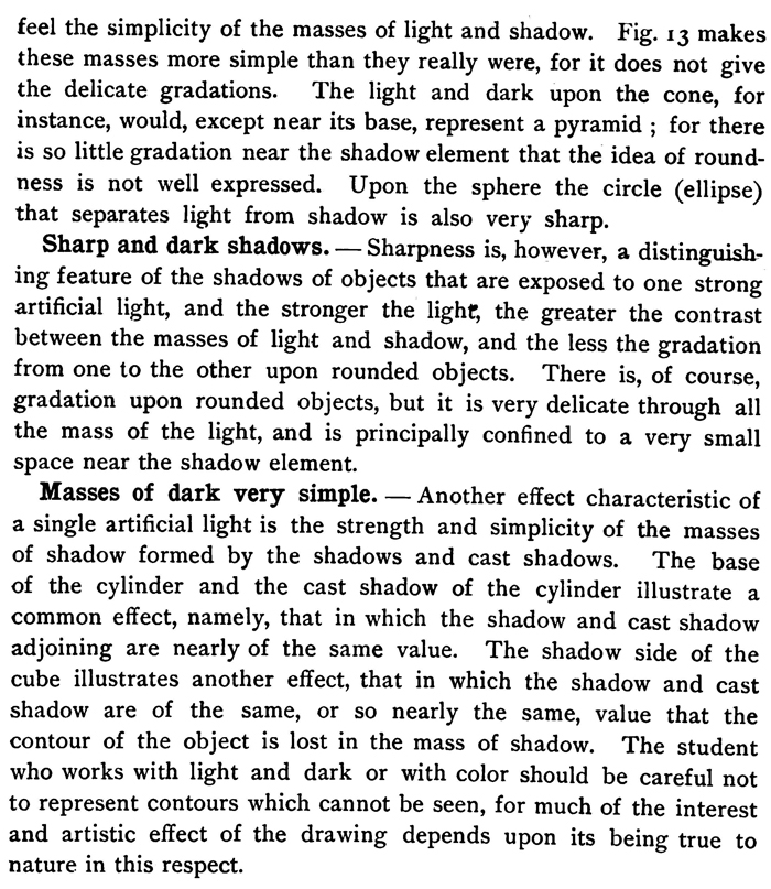 ARTIFICIAL LIGHT AT THE SIDE.Fig. 13 represents the same group when exposed to the rays of a very powerful lamp placed near the group. Strong contrasts of light and shade.The effect is due to the contrast of strong lights and deep shadows, and at first glance we feel the simplicity of the masses of light and shadow. Fig. 13 makes these masses more simple than they really were, for it does not give the delicate gradations. The light and dark upon the cone, for instance, would, except near its base, represent a pyramid ; for there is so little gradation near the shadow element that the idea of roundness is not well expressed. Upon the sphere the circle (ellipse) that separates light from shadow is also very sharp. Sharp and dark shadows.Sharpness is, however, a distinguishing feature of the shadows of objects that are exposed to one strong artificial light, and the stronger the light, the greater the contrast between the masses of light and shadow, and the less the gradation from one to the other upon rounded objects. There is, of course, gradation upon rounded objects, but it is very delicate through all the mass of the light, and is principally confined to a very small space near the shadow element. Masses of dark very simple.Another effect characteristic of a single artificial light is the strength and simplicity of the masses of shadow formed by the shadows and cast shadows. The base of the cylinder and the cast shadow of the cylinder illustrate a common effect, namely, that in which the shadow and cast shadow adjoining are nearly of the same value. The shadow side of the cube illustrates another effect, that in which the shadow and cast shadow are of the same, or so nearly the same, value that the contour of the object is lost in the mass of shadow. The student who works with light and dark or with color should be careful not to represent contours which cannot be seen, for much of the interest and artistic effect of the drawing depends upon its being true to nature in this respect.