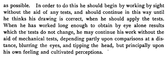 TESTS FOR VALUES.Perfect sight not common.The first and most difficult problem for the art student is to learn to see, for only a few ever learn to see perfectly; and those not giving the matter special attention seldom see the actual appearance of either form, light and shade or color. To realize perfectly what the eye pictures for the mind to read concerning simply the apparent forms of objects requires many years of serious study, and is so difficult that even after this study the artist of reputation is very apt to be deceived and draw what is very different from the image of the eye. In " Free-Hand Drawing" it was shown that a course in free-hand perspective assists the student to avoid faulty representations of the geometric forms, which are most likely to deceive even the practiced eye of the artist. Any student who draws the geometric forms, and tests them as explained in "Free-Hand Drawing," will soon realize that it is difficult to see correctly; for he finds what he thinks he sees to be very different from what the tests prove that he does see, and it is easy for him to convince himself that he cannot see correctly. Values more difficult than drawing.To convince an art student that he cannot see light and shade or color correctly is far more difficult than to prove that he cannot see form correctly. To draw correctly requires, first, an eye naturally true, and, second, a serious and extended course of study; but almost every serious student can in time teach himself to represent form correctly. The same student may work many months, even with the assistance of a teacher, and fail to see values or color correctly. To give the actual facts pictured in the eye concerning light, dark, and color is so difficult that few succeed; and even after years of study many see in nature only the actual facts known, or what they have become accustomed to think they see concerning the local colors of objects. Values not taught.If artists and teachers generally made the study of values as important as that of form, doubtless many students who do not understand what value means would become able to see values correctly; but the number would be small compared with that of those who are able to draw correctly, for serious students of the best teachers often work for many months before they realize how incorrectly they see values. The teacher who insists upon correct values requires much patience and ingenuity, for his pupils cannot readily help- themselves, nor can they believe the teacher who tells them, for instance, that they ought to see, in some special group, dark blue lighter than yellow, when they know that they see it as they think it ought to appear, — darker than the yellow. In such cases the teacher must either be content to say : "If you cannot see it, you must draw it as I say, and in time you will see it as I do," or he must prove to them that at first their eyes tell them nothing but the most glaring falsehoods about all that they see. When pupils realize this fact, and have once received a genuine sight impression concerning values, they will ever afterward see things in a new way, and their improvement will be rapid. Eye sees details instead of values.To see values and realize the effect of the masses, the eye must be used for this purpose only. This is a difficult problem for the student, for naturally the eye is focused upon a single detail, which is clearly seen. The vision passes rapidly over the whole of the group, taking in all its details by means of this careful study, which is of just the same nature as that which the scientist bestows through his microscope upon the specimens he studies. The only difference in their methods is that the motion of the eye of the art student is very rapid, and that the lens of the eye takes the place of the microscope. The scientist sees details, and very properly, since these are what he is to describe. The art student also sees details, and too often his work indicates that he must have examined each little bit as if through a microscope. In his first drawings he usually so magnifies the importance of every detail that his drawing is unintelligible, and gives not the faintest suggestion of the impression produced upon the eye which sees the effects of light, dark, and color in their true relations. The art student must learn that the artist and scientist work for entirely different ends, — that the aim of the artist is not detail, but the spirit and character of the whole, and that this cannot be obtained without making it of first importance and thinking first of the long lines, the large masses, and the effect of the whole subject. Blurred vision necessary.The effect of any subject is never realized when the student looks at any one part ; he must look at the group all at once. The whole of any subject can be seen at once only by seeing all its parts equally and thus indistinctly. That is, the eye must focus on no one part, but be in focus for an object in front of or behind the group ; then all its parts may be seen indistinctly at one time. The student will realize what is meant by blurred vision by closing the eyes gradually until the group can barely be seen between the lids and the lashes ; this cuts off most of the light and obstructs the sight so that the objects are blurred. Blurred vision may also be obtained by holding a pencil in the hand and in front of the group and looking at the pencil, which will be seen sharply, while the group will be seen very indistinctly. To see the whole at once is difficult for the art student, but the artist finds it easier than the searching gaze which the art student employs, because the artist sees effects unconsciously with blurred vision, which does not tire the eyes. Many aids to the correct seeing of values have been used ; among them the following are those of most assistance to the student. Claude Lorrain mirror.This is a mirror which gives a reduced image of the object, and has a b