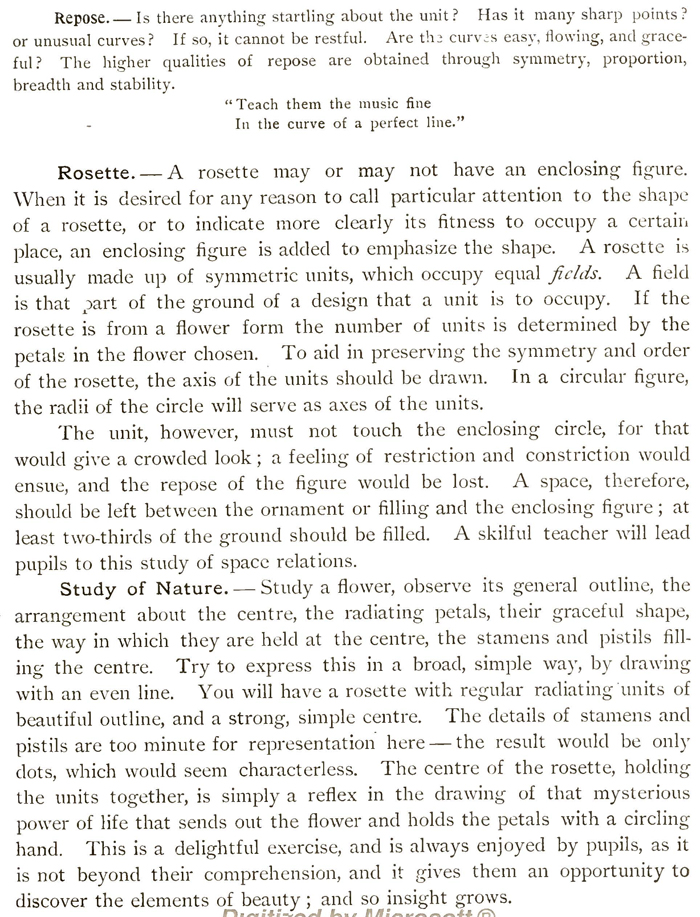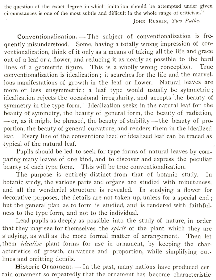 Lead pupils as deeply as possible into the study of nature, in order that they may see for themselves the spirit of the plant which they are studying, as well as the more formal matter of arrangement. Then let them idea/the plant forms for use in ornament, by keeping the characteristics of growth, curvature and proportion, while simplifying outlines and omitting details.