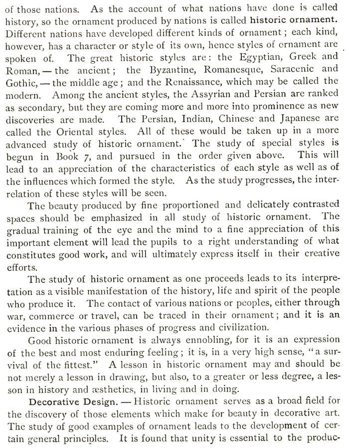 The beauty produced by fine proportioned and delicately contrasted spaces should be emphasized in all study of historic ornament. The gradual training of the eye and the mind to a fine appreciation of this important element will lead the pupils to a right understanding of what constitutes good work, and will ultimately express itself in their creative efforts. The study of historic ornament as one proceeds leads to its interpretation as a visible manifestation of the history, life and spirit of the people who produce it. The contact of various nations or peoples, either through war, commerce or travel, can be traced in their ornament ; and it is an evidence in the various phases of progress and civilization.