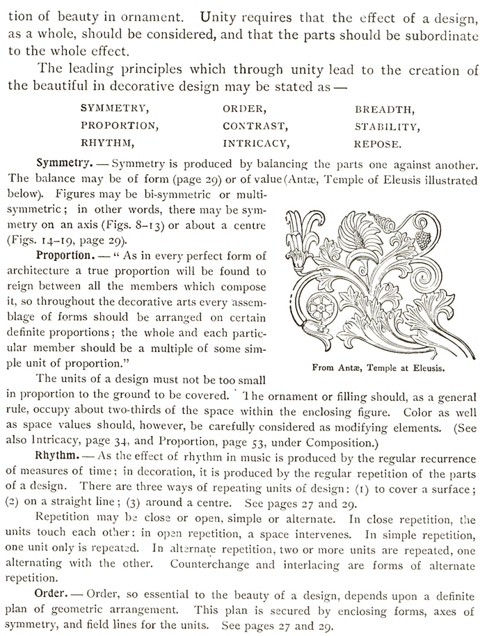 Historic ornament serves as a broad field for the discovery of those elements which make for beauty in decorative art. The study of good examples of ornament leads to the development of certain general principles. It is found that unity is essential to the production of beauty in ornament. Unity requires that the effect of a design, as a whole, should be considered, and that the parts should be subordinate to the whole effect.