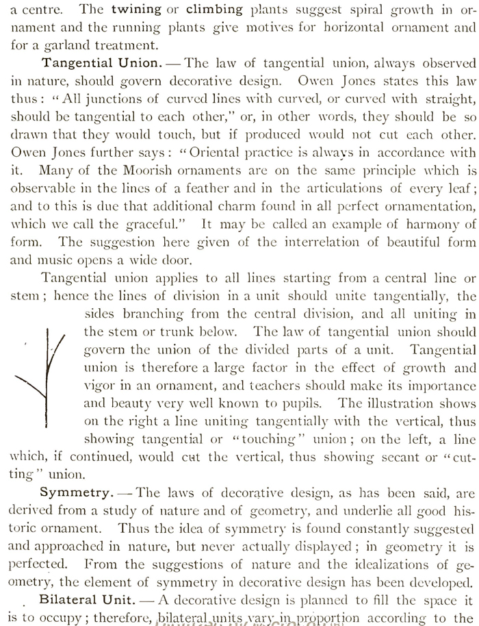 The law of tangential union, always observed in nature, should govern decorative design. Owen Jones states this law thus : All junctions of curved lines with curved, or curved with straight, should be tangential to each other," or, in other words, they should be so drawn that they would touch, but if produced would not cut each other. Owen Jones further says : "Oriental practice is always in accordance with it. Many of the Moorish ornaments are on the same principle which is observable in the lines of a feather and in the articulations of every leaf ; and to this is due that additional charm found in all perfect ornamentation, which we call the graceful." it may be called an example of harmony of form. The suggestion here given of the interrelation of beautiful form and music opens a wide door.