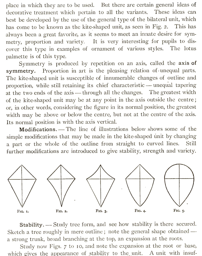 Symmetry is produced by repetition on an axis, called the axis of symmetry. Proportion in art is the pleasing relation of ,unequal parts. The kite-shaped unit is susceptible of innumerable changes of outline and proportion, while still retaining its chief characteristic—unequal tapering at the two ends of the axis — through all the changes. The greatest width of the kite-shaped unit may be at any point in the axis outside the centre ; or, in other words, considering the figure in its normal position, the greatest width may be above or below the centre, but not at the centre of the axis. Its normal position is with the axis vertical.