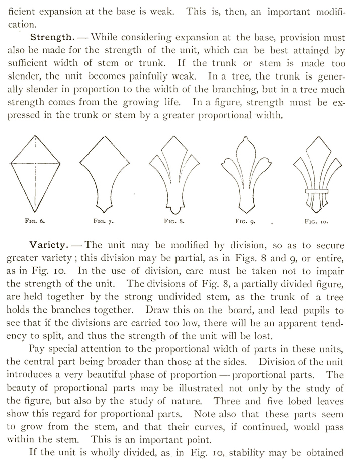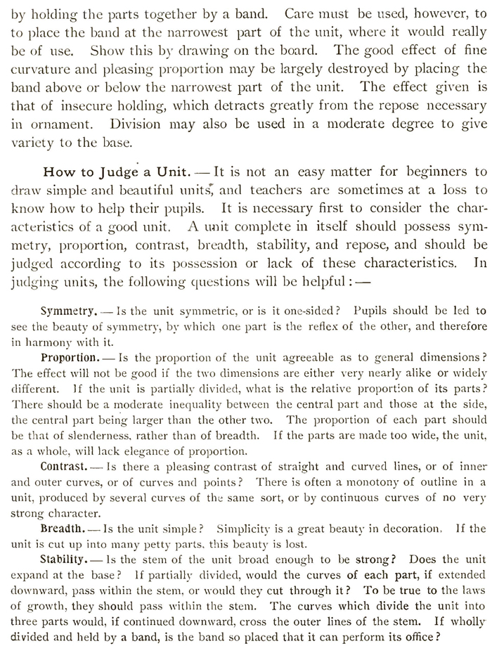 It is not an easy matter for beginners to draw simple and beautiful units., and teachers are sometimes at a loss to know how to help their pupils. It is necessary first to consider the characteristics of a good unit. A omit complete in itself should possess symmetry, proportion, contrast, breadth, stability, and repose, and should be judged according to its possession or lack of these characteristics.
