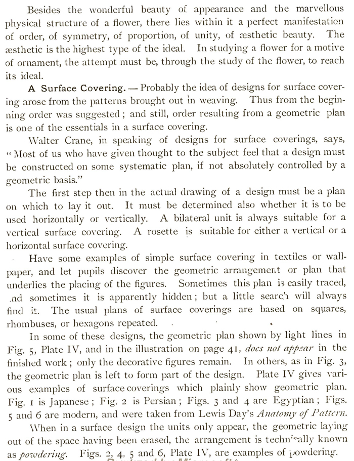Besides the wonderful beauty of appearance and the marvellous physical structure of a flower, there lies within it a perfect manifestation of order, of symmetry, of proportion, of unity, of esthetic beauty. The esthetic is the highest type of the ideal. In studying a flower for a motive of ornament, the attempt must be, through the study of the flower, to reach its ideal.