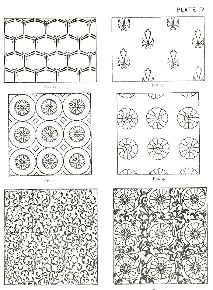 When in a surface design the units only appear, the geometric laying out of the space having been erased, the arrangement is techn'-ally known as powdering. Figs. 2, 4, 5 and 6, Plate IV, are examples of powdering.