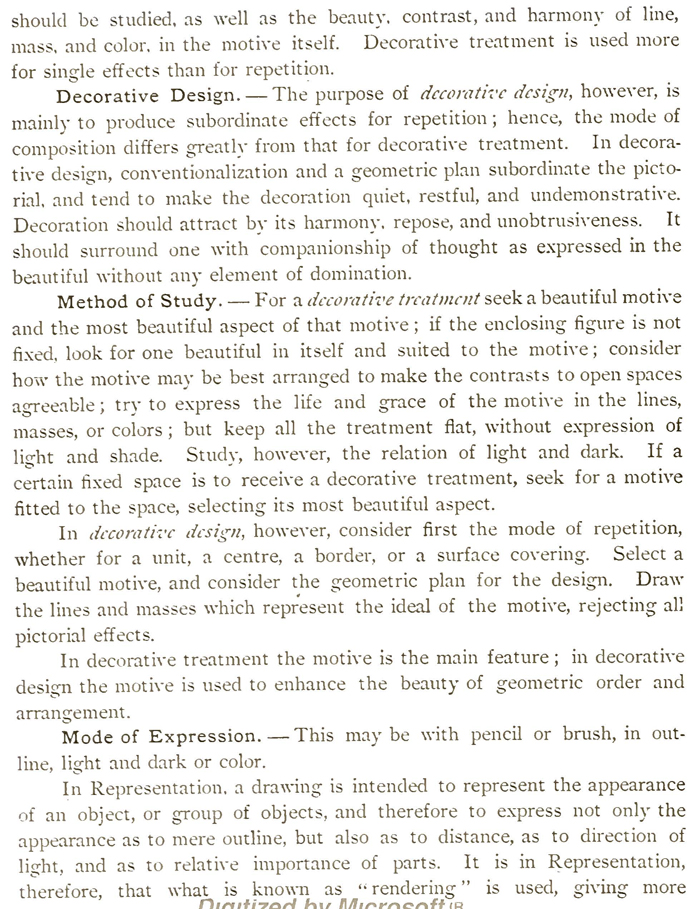 In the subject of Representation, you aim to reach this end not only through practice in drawing the appearance of objects and study for its principles, but also through Representative Design or pictorial composition. So in the subject of Decoration, aim to increase the productive