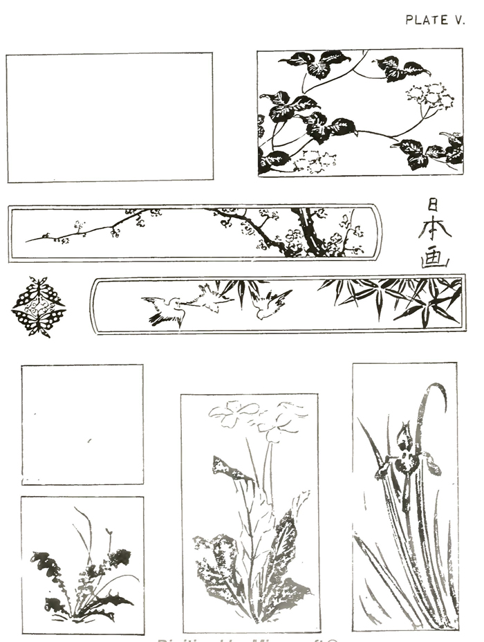 The decorative treatment of a natural form occupies a middle ground between a picture and a decorative design. In all three, the composition of line, mass, and color is a decided element. In a decorative design the composition has a geometric basis ; while in a picture and in a decorative treatment, the composition depends on agreeable contrasts of line, mass, and space, with more regard to pictorial effect than to geometric order. In a picture, the representation of the object in light and shade, with all the harmonizing accessories of composition of line, light and dark, etc., is the main thing. In a decorative treatment, the composition of line, mass, and color is the chief element, while the representation is carefully kept. The drawing is true and spirited, but without the pictorial element and the modelling given by light and shade. The contrasts are not of light and shade, but of light and dark, or of light,. dark, and middle tone, as will be seen in Plate V. Everything is kept in flat effect, whether the work be in black and white or in color.